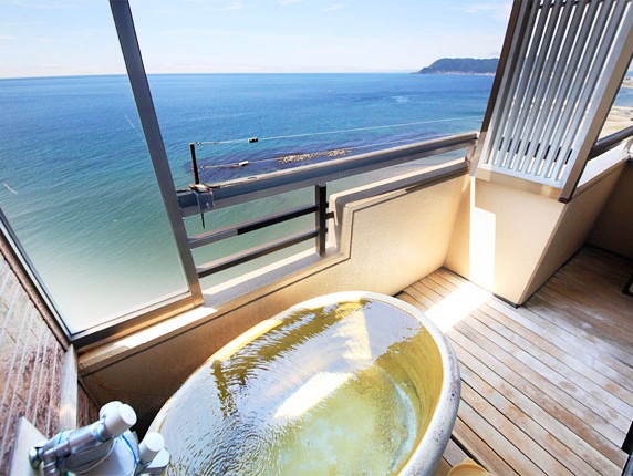 4階:露天風呂併設大浴場(和の風情) 石庭に囲まれた落ち着いた雰囲気の露天風呂があります。潮風を直接感じながら、波の音を聞きながらゆったりと浸かることができます。