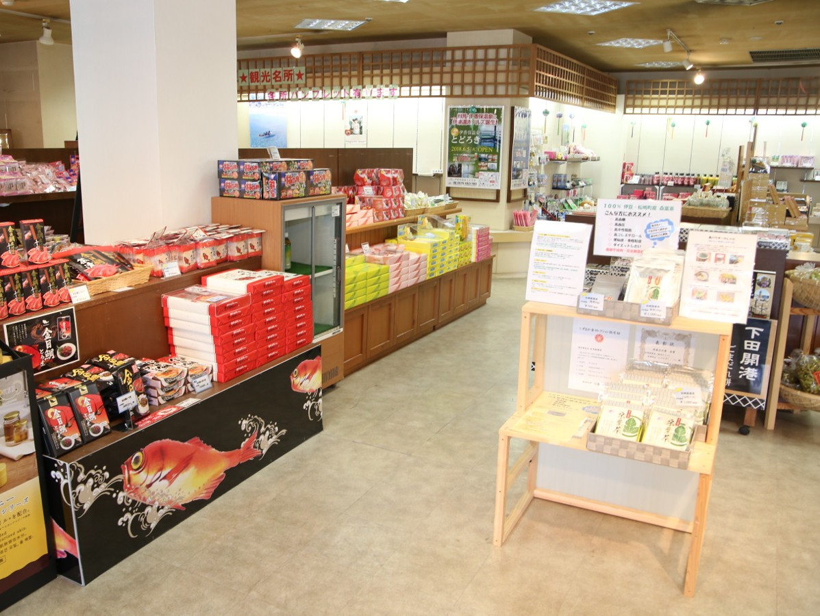 下田の名物「下田バーガー(金目鯛のフライ)」が食べられるお店や、巨大な回転寿司、干物などの地場産品が並ぶ市場が入っています。観光と買い出しを同時に楽しめます。