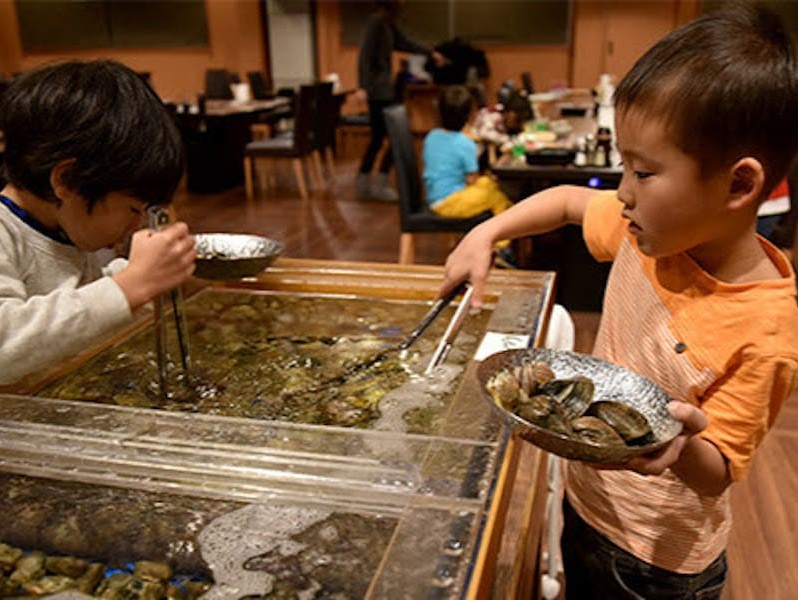 レストランは、バイキングスタイルでバイキングには珍しいお子様から大人までも喜ぶ水槽にあさりが入っているバイキング。