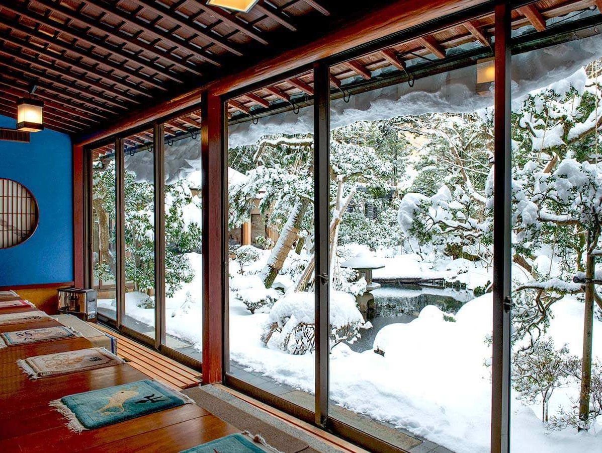 夕食、朝食時のテーブル席、お座敷への案内
