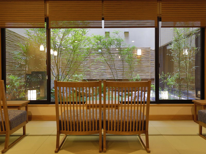 夕食、朝食時のテーブル席、お座敷への案内
