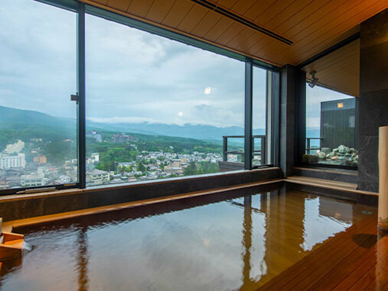 最上階に設けた眺望浴場では、湯畑をはじめとする2つの源泉から引き込んだ名湯に入り放題です。