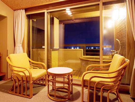 4階:露天風呂併設大浴場(和の風情) 石庭に囲まれた落ち着いた雰囲気の露天風呂があります。潮風を直接感じながら、波の音を聞きながらゆったりと浸かることができます。